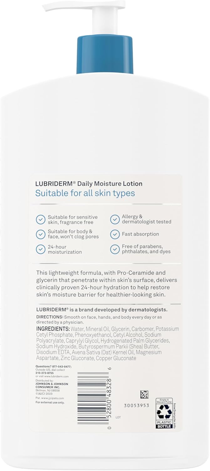 - زجاجة سعة 24 أونصة سائلة من لوشن لوبريديرم المرطب اليومي الخالي من العطور + برو-سيراميد، زبدة الشيا والجلسرين للمساعدة في استعادة حاجز ترطيب البشرة للحصول على بشرة أكثر صحة.