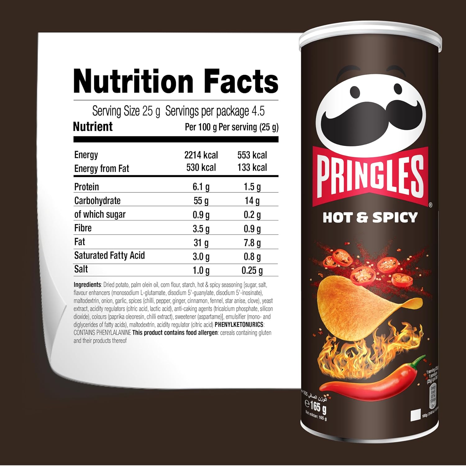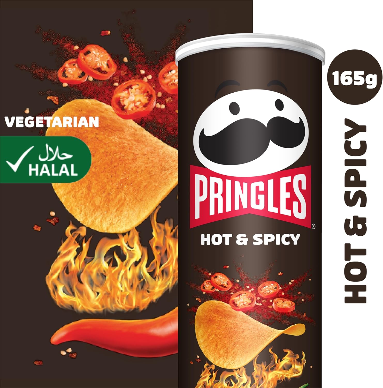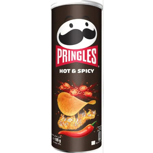 - رقائق برينجلز، ذات الشكل الفريد والنكهة المثالية، تشتهر بشكلها المميز ومذاقها الشهي. رقائق برينجلز بنكهة البطاطس الحارة والمتبلة مغطاة بالكامل بالتوابل.